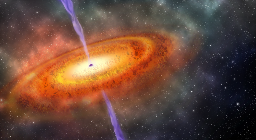 Este gigante encontra-se escondido num quasar. E os quasares são objectos extremamente luminosos, compostos por enormes buracos negros que agregam a matéria no centro de galáxias.