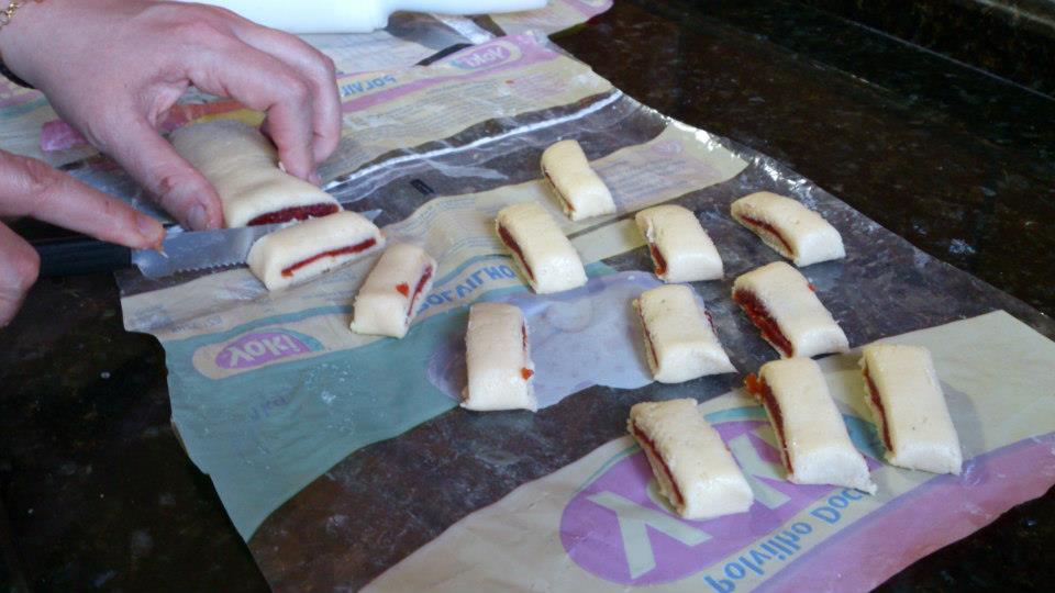 - Abra a massa entre dois plásticos, não muito fina, coloque a goiabada, dobre corte os pedaços e coloque em assadeira untada e enfarinhada.