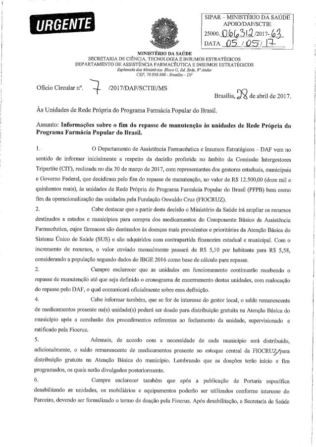 Leia a carta na íntegra e abaixo, o documento do Ministério da Saúde que acaba com a Farmácia Popular.