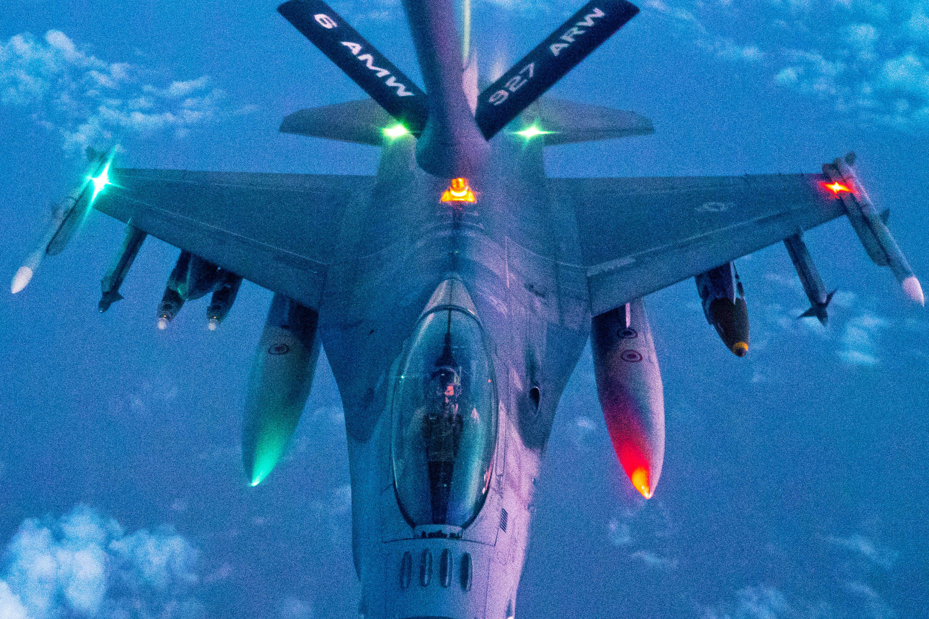 Um F-16 Fighting Falcon da Força Aérea recebe o combustível de um KC-135