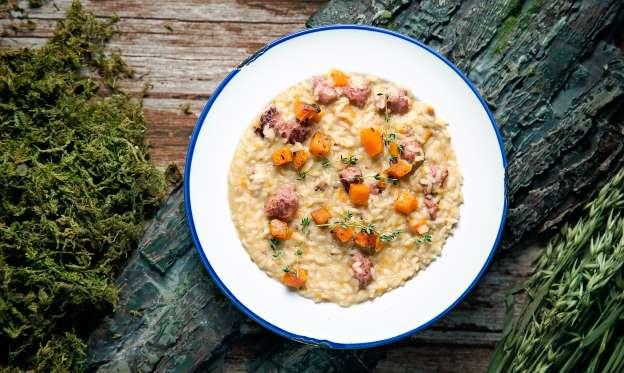 Desligue o fogo, adicione a linguiça e o purê de abóbora reservados e misture. Por fim, acrescente o queijo parmesão, a manteiga e as ervas frescas.