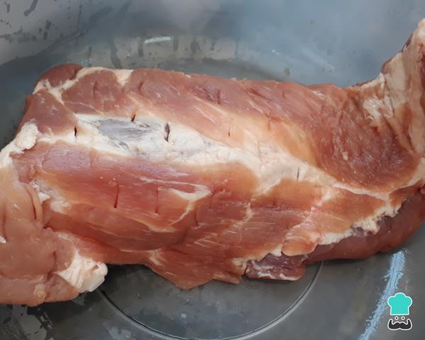 1. Limpe bem a peça de costela de porco, retirando o excesso de gordura, e faça furos nela com a ponta da faca - isso ajuda o tempero a penetrar melhor. Reserve.