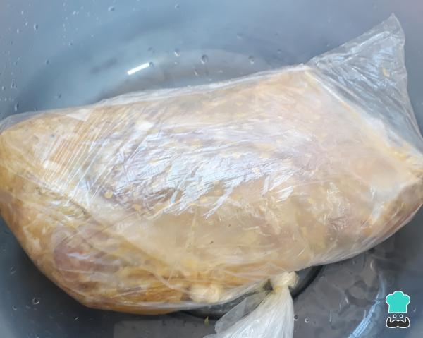 3. Coloque a costelinha dentro de dois sacos plásticos, para temperar ela sem correr o risco de furar. Agora despeje a marinada e amarre bem. Deixe descansar por, no mínimo, 2 horas dentro da geladeira.