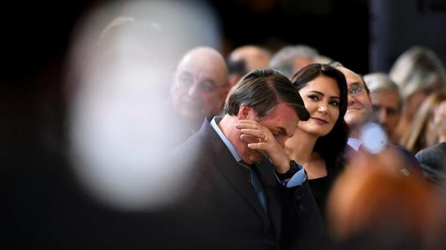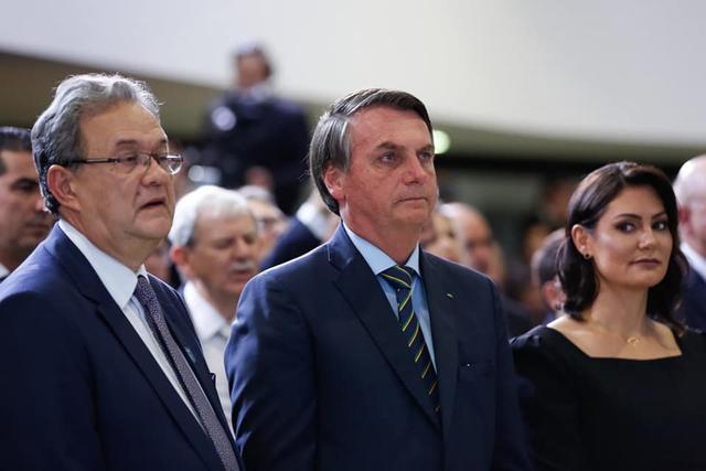 lado da primeira-dama Michelle, o presidente Jair Bolsonaro se emociona durante