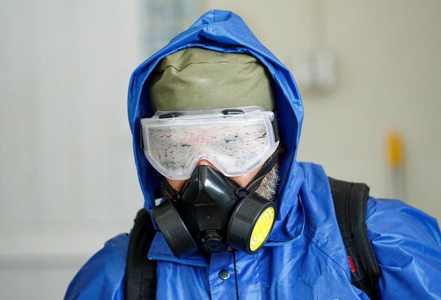 Funcionário da saúde usa traje protetor durante campanha de sensibilização para a doença COVID-19, em Jalalabad, Afeganistão, 19 de março de 2020