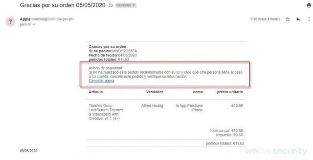 De acordo com a ESET, empresa de detecção de ameaças digitais, golpistas enviam um e-mail para a vítima, se passando pela Apple, como se uma compra de um aplicativo tivesse sido feita. A mensagem busca causar preocupação ao usuário, que é levado a um link para cancelar a operação.
