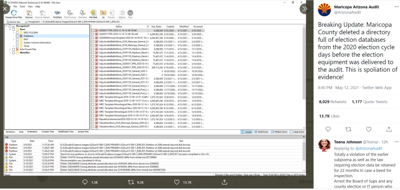 Exame eleitoral do Arizona revela grande fraude eleitoral no condado de Maricopa! Os democratas deliberadamente excluíram um diretório cheio de bancos de dados eleitorais cerca de 10 dias antes das máquinas de votação serem entregues à equipe de auditoria do Senado do AZ. Você roubou a escolha!