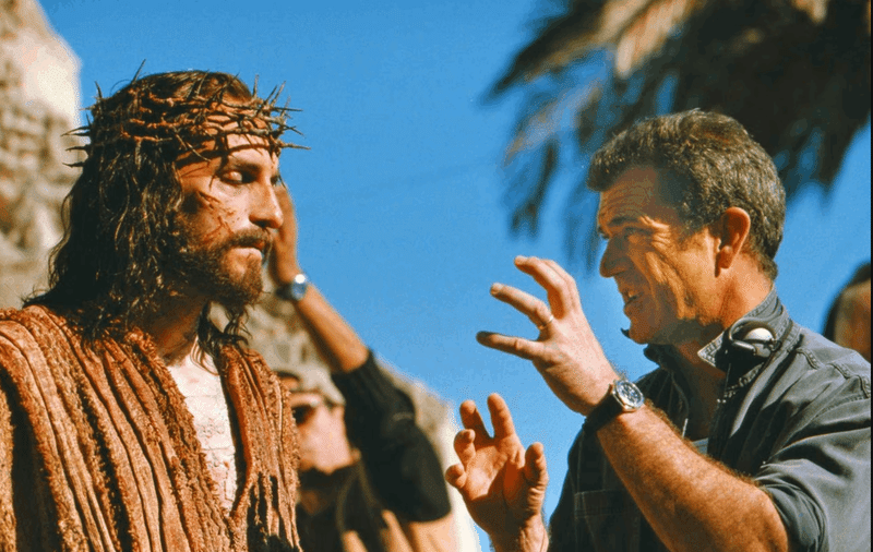 [Diretor Mel Gibson e Jim Caviecell que interpreta Jesus]