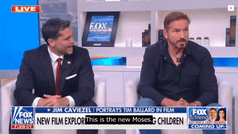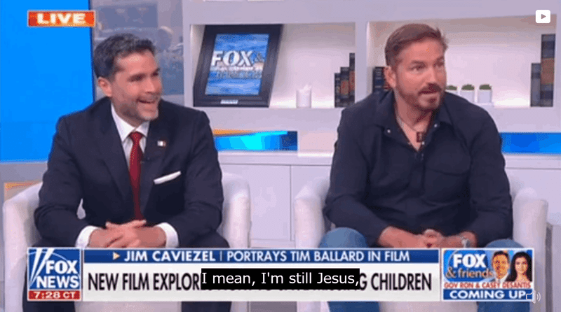 Além disso, em entrevista à Fox News no dia seguinte à exibição, o Sr. Jim Caviecell disse que o presidente Trump era [ele é o novo Moisés] e que ele próprio era [ainda sou Jesus].