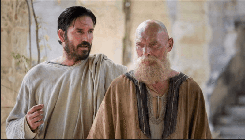 [Jim Caviecell, que interpreta Jesus em um manto esbranquiçado]